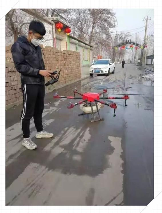 18级无人机一班的杨晓东来自张家口市万全区,作为在校大学生,他具有很强的社会责任感,一直用自己的实际行动,与大家一起抗击疫情。他主动与村干部联系,根据自己所学的知识用无人机为家乡喷撒消毒液。在这个特殊的时期,他希望能为社会承担一份责任,与大家共克难关。
